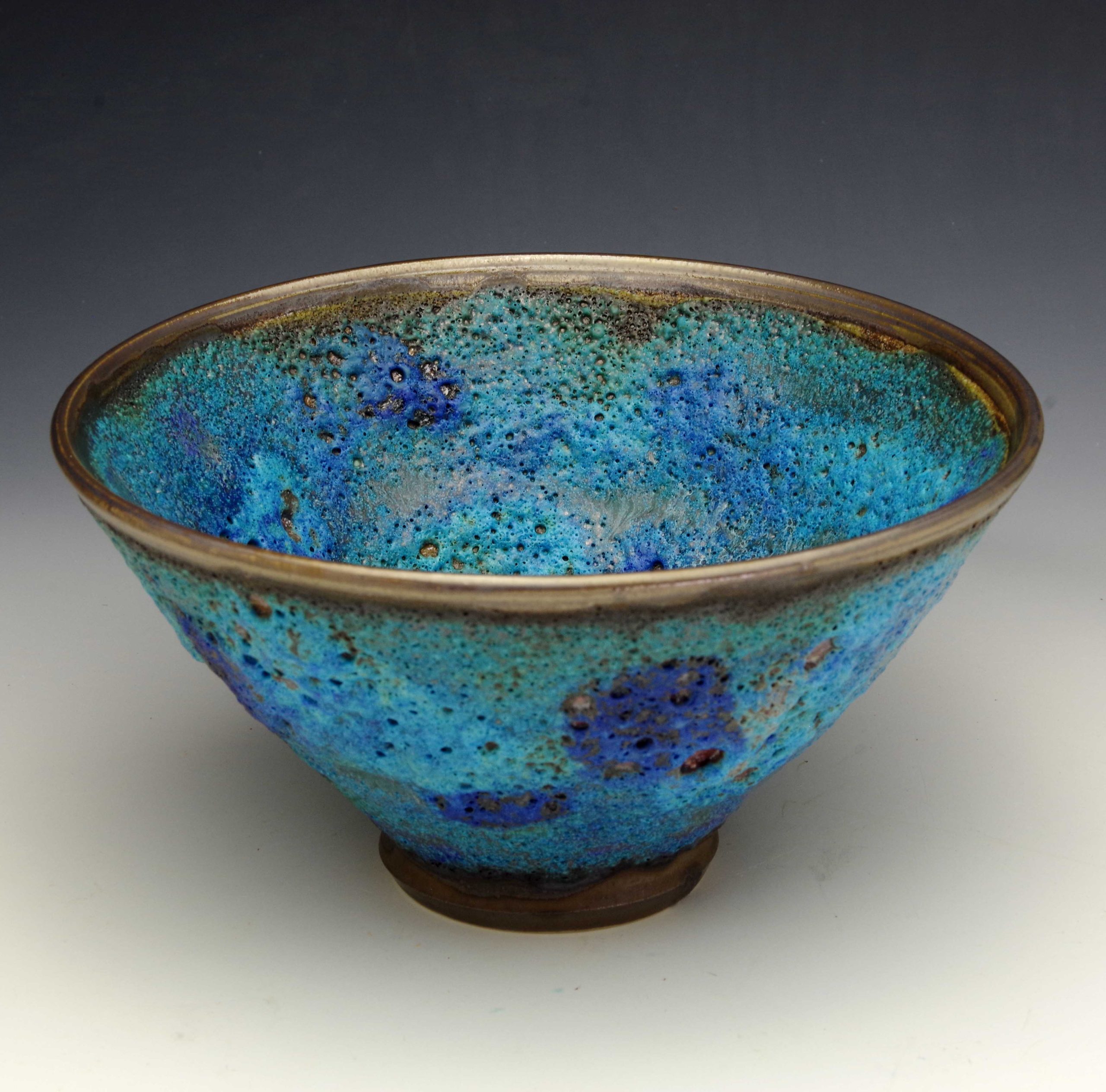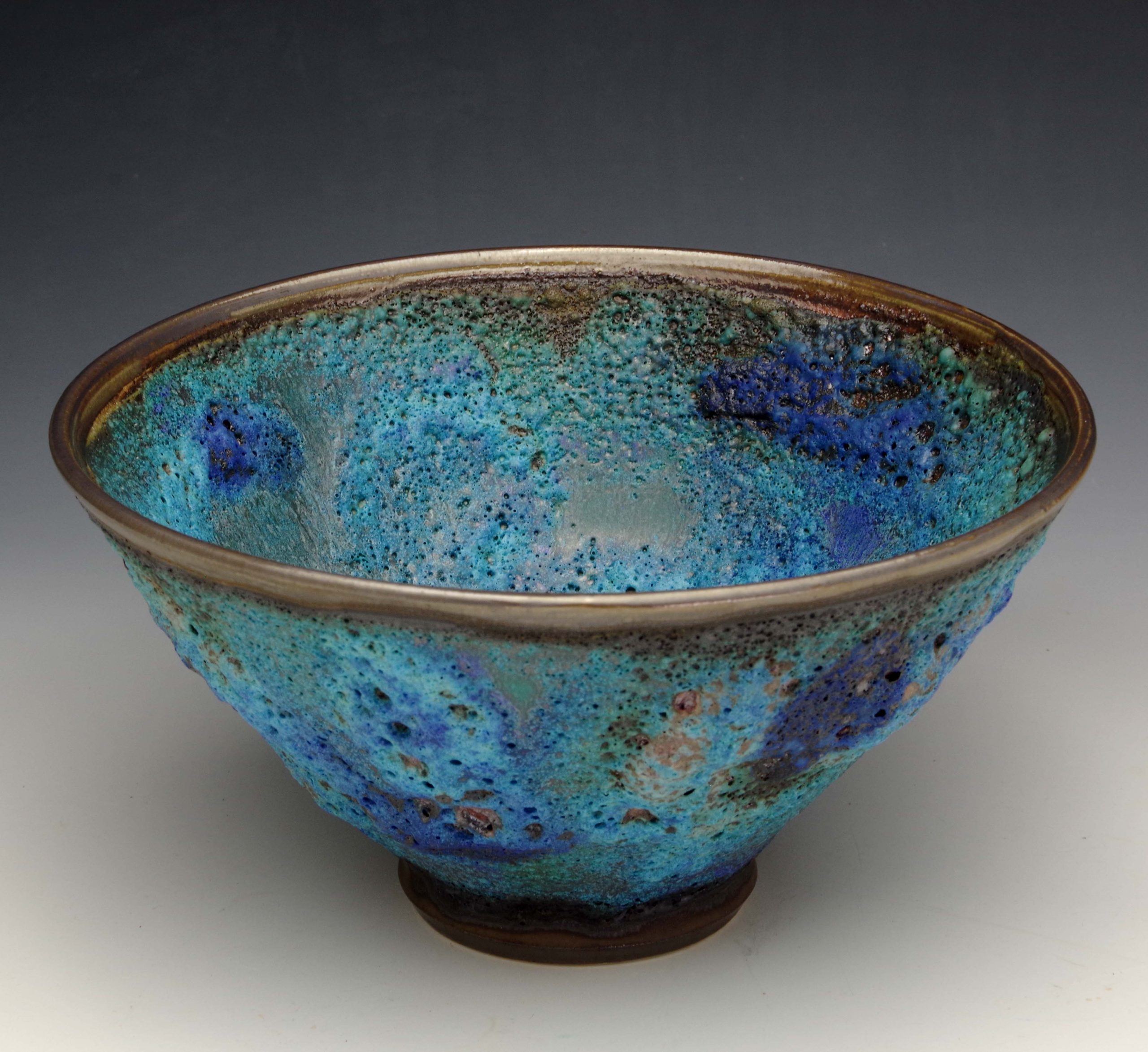 This piece is a medium sized bowl with a crater or lava type glaze in a range of bright blues set off by a bronze rim and raised foot.