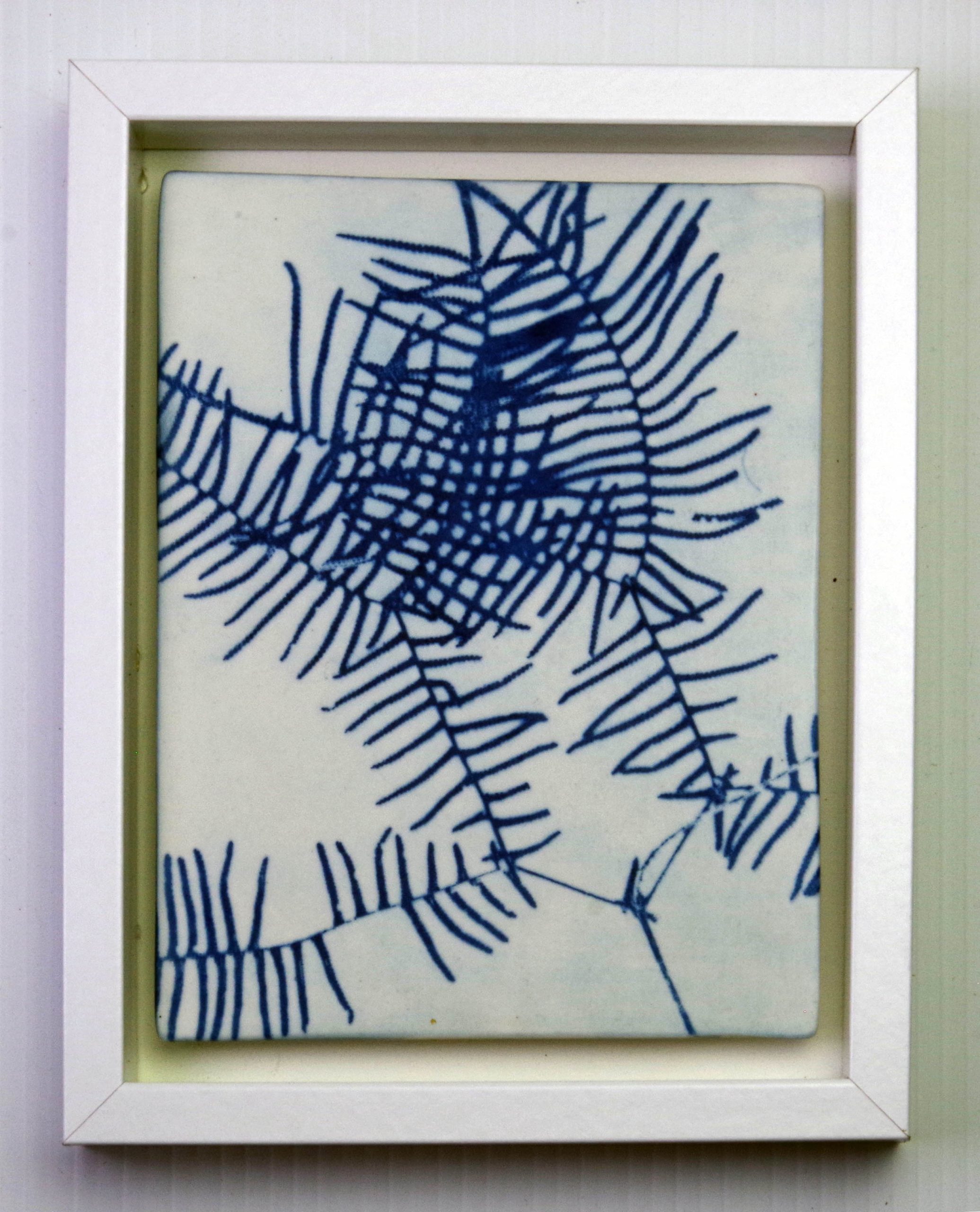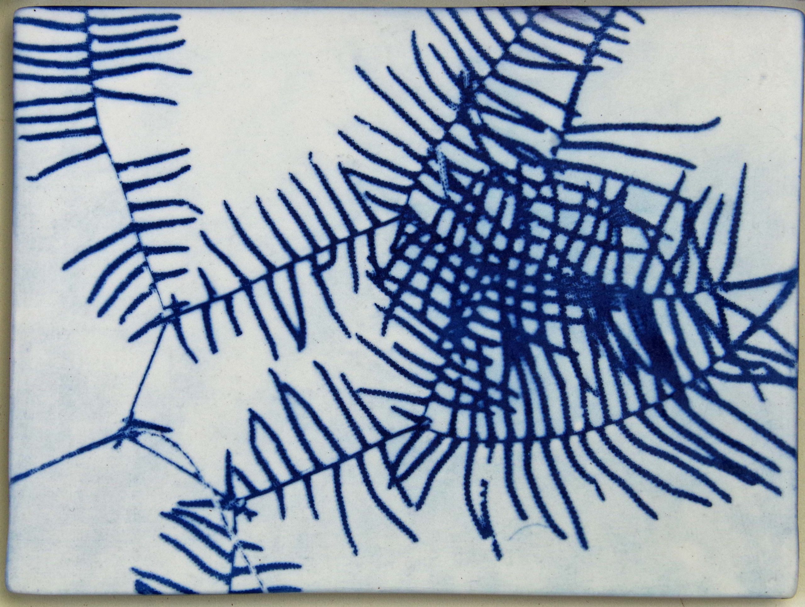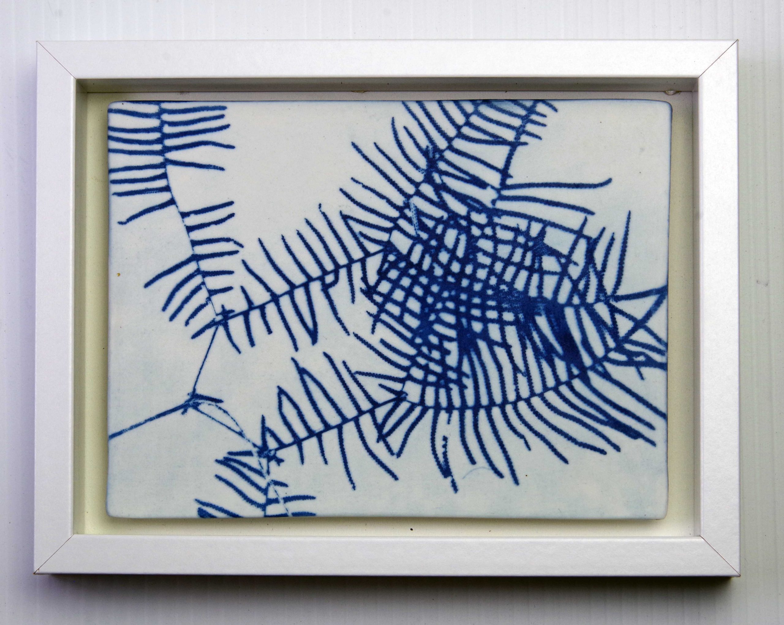 Artist Statement: “My artwork merges ceramics and cyanotype photography through extensive research and experimentation. Using ferns gathered by my mother, I have exposed images, with light and time, directly onto porcelain. This work gathers memory, material, and meaning, honouring her quiet research and my own impulse to preserve, transform, and reimagine legacy.”
