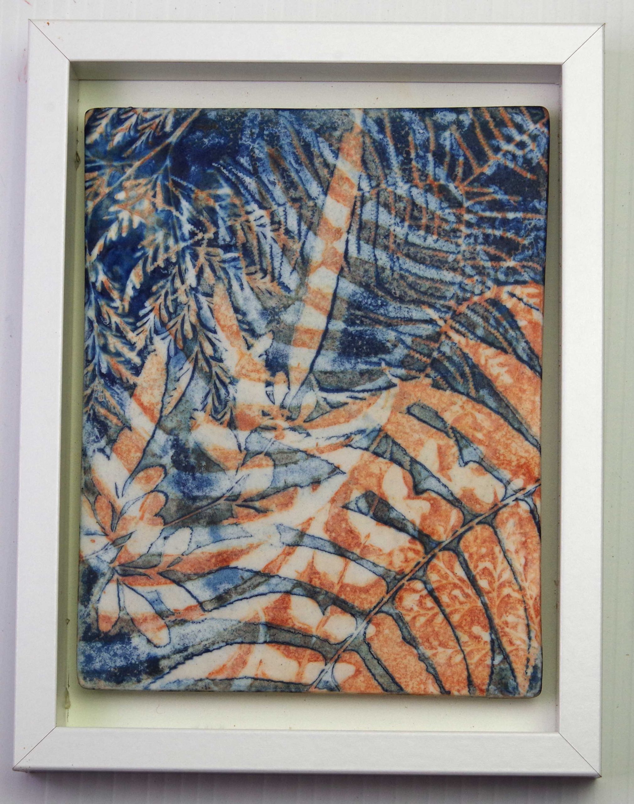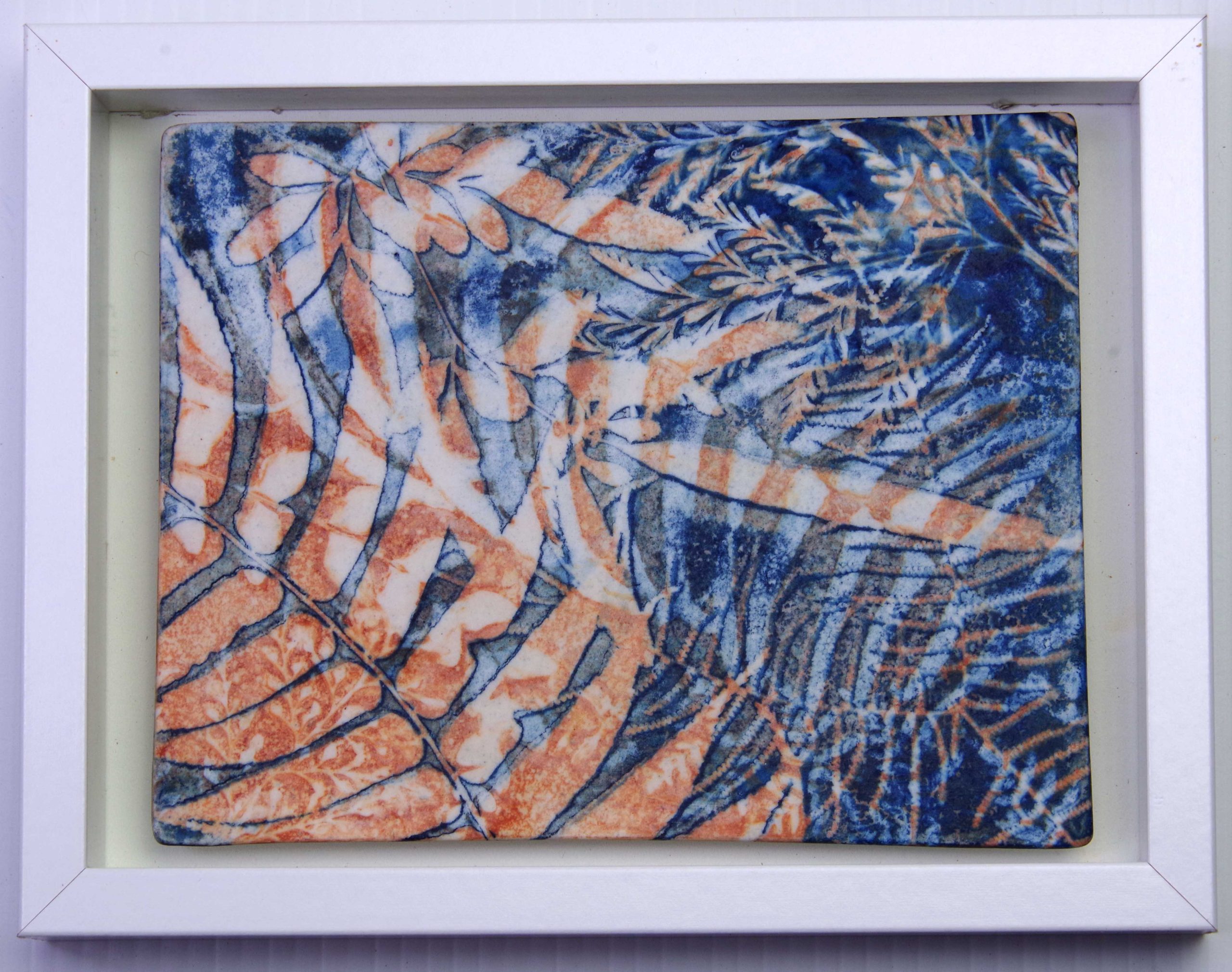 Float mounted, framed cyanotype artwork on porcelain without glass.