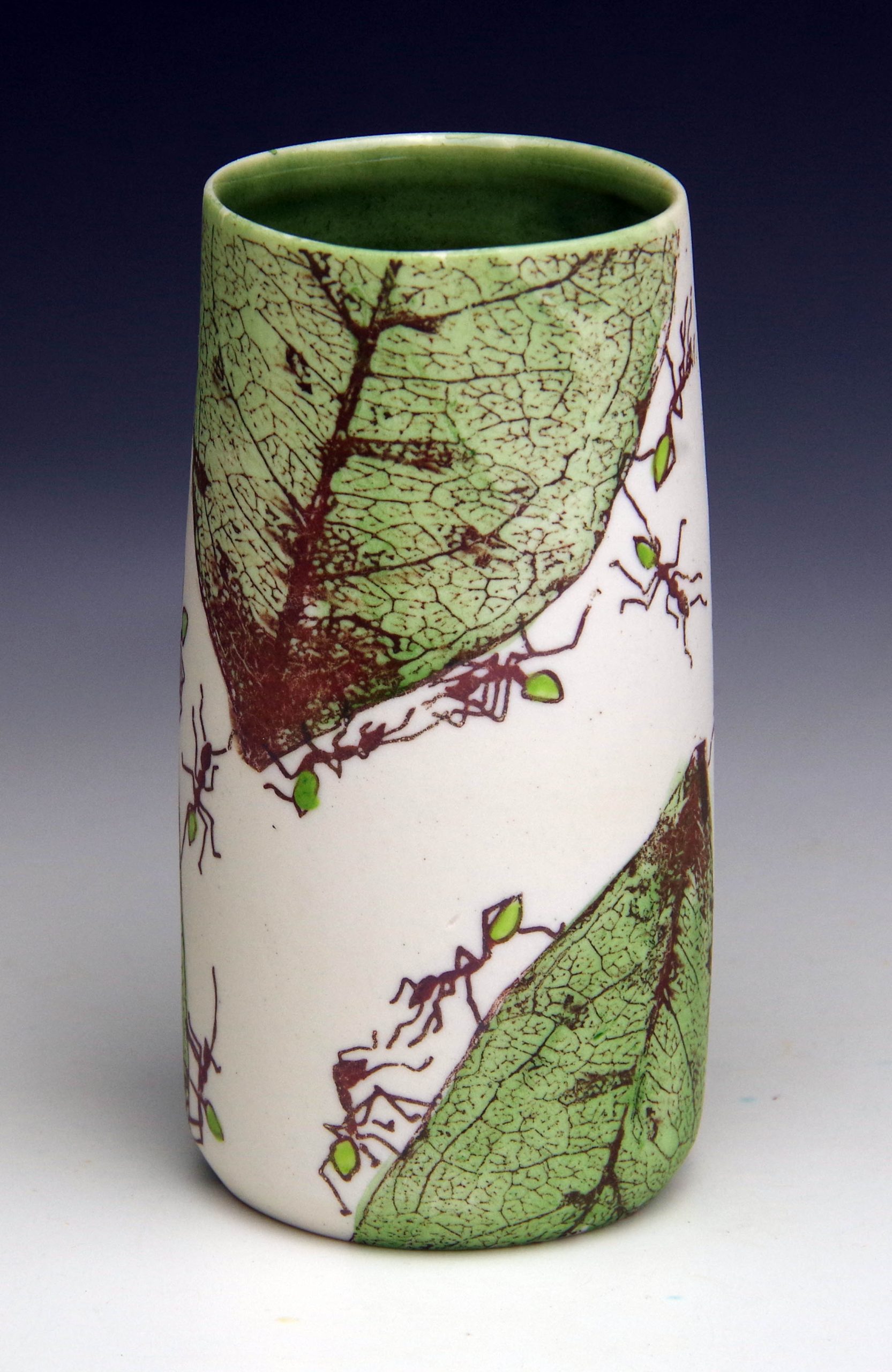 This series of vessels are the wheel thrown porcelain. The green tree ants of tropical Australia are very social creatures, very engaging to watch as they cooperate working on nest building and food collecting. These pieces attempt to capture their character and antics. Extending on my previous work with scanned skeleton leaf images applied as laser print decals, I am exploring the use of overglaze in this work. Requiring a third, lower firing, the colour choice is far more extensive than is possible with glazes. Employing glazed and unglazed, polished surfaces, image designs are composed directly onto the surface so each piece tells a unique story. The larger than life size ants bring a sense of fun to this body of work.